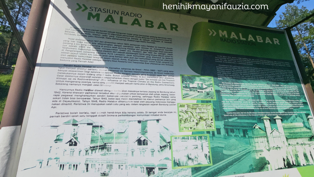 Nah, seperti itulah tulisan yang ada di plang tersebut. Plang sejarah Stasiun Radio Malabar tersebut tersedia dalam 2 bahasa. Tulisan sebelah kiri berbahasa Indonesia dan tulisan di sebelah kanan berbahasa Inggris. Pada bagian bawah setelah tulisan terpampang foto-foto saat Stasiun Radio Malabar masih kokoh berdiri dan beroperasi normal.