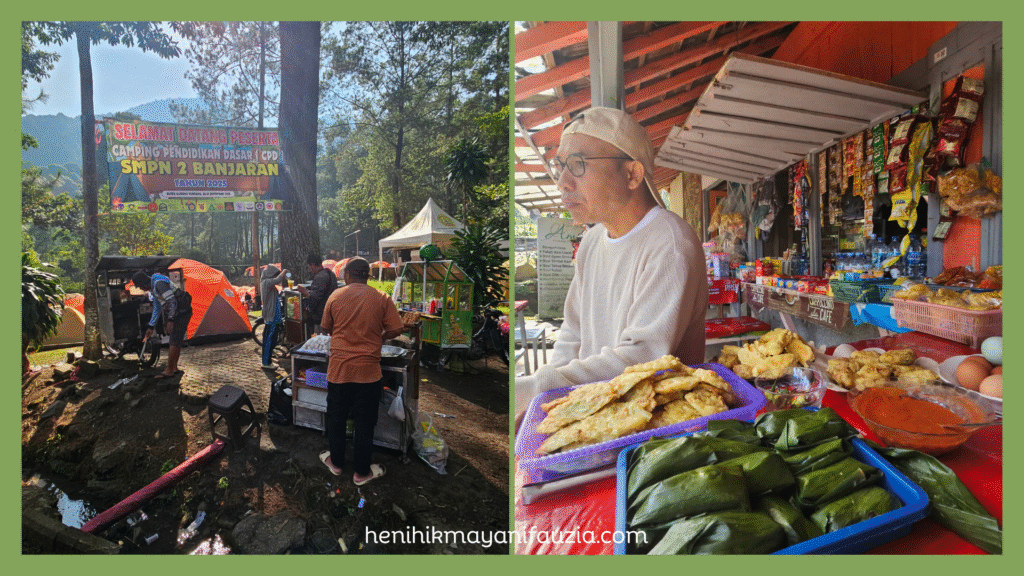 Anak-anak SMPN 2 Cimaung sedang mengadakan perkemahan disini. Sepertinya ini adalah acara sekolah karena saya melihat ada bapak dan ibu guru yang mendampingi anak-anak ini. Daan, ini niih yang saya suka ada banyak yang jualan jajanan hehe…saya beli cilok, bilor dan kerupuk yang dikasih bumbu kacang pedas. Aduuh enak banget setelah semalam kedinginan di tenda glamping hehehe. Serasa menemukan harta karun bisa jajan disini.