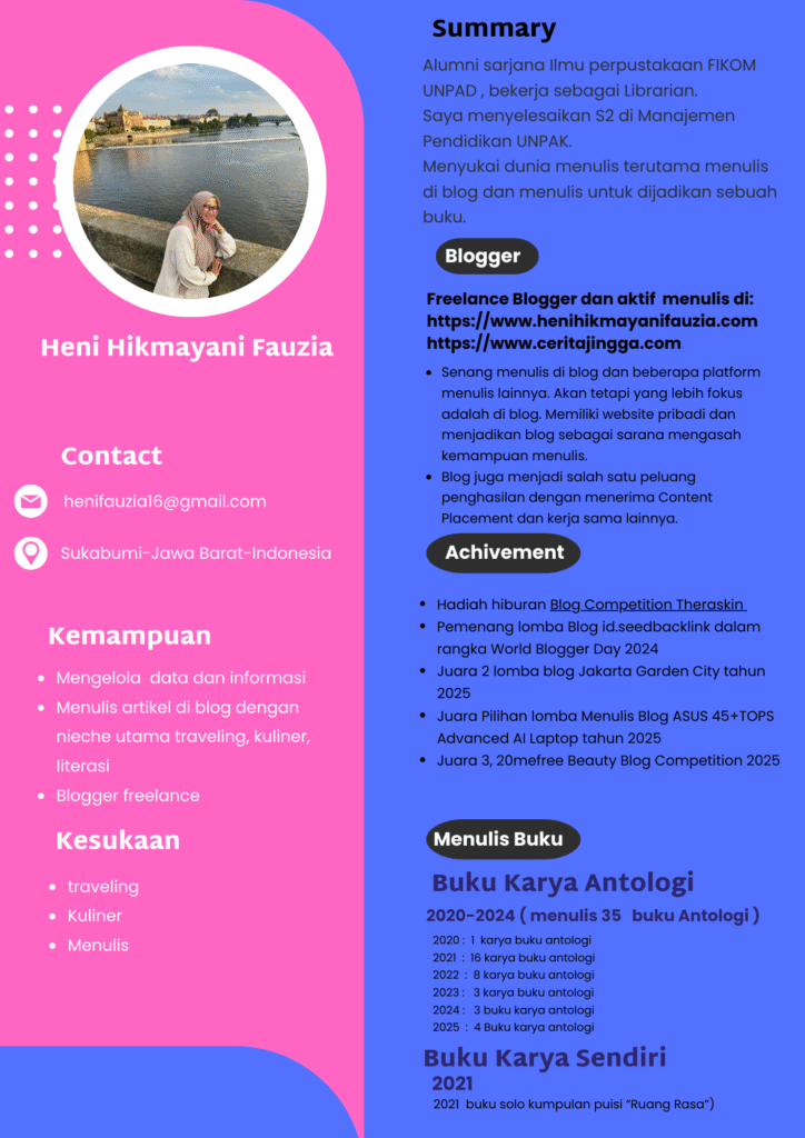 Heni Hikmayani Fauzia adalah nama lengkap saya. Di keseharian biasa dipanggil Heni. Saya seorang ibu dari dua orang anak. Kegiatan sehari-hari berprofesi sebagai Pustakawan di sebuah sekolah SMA Islam berasrama.