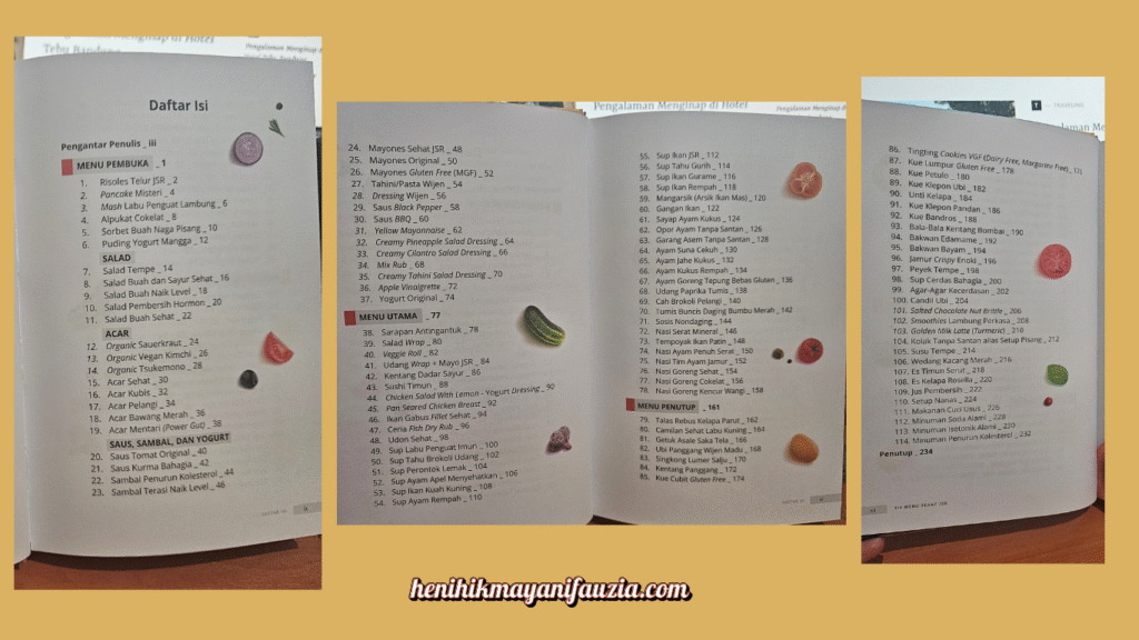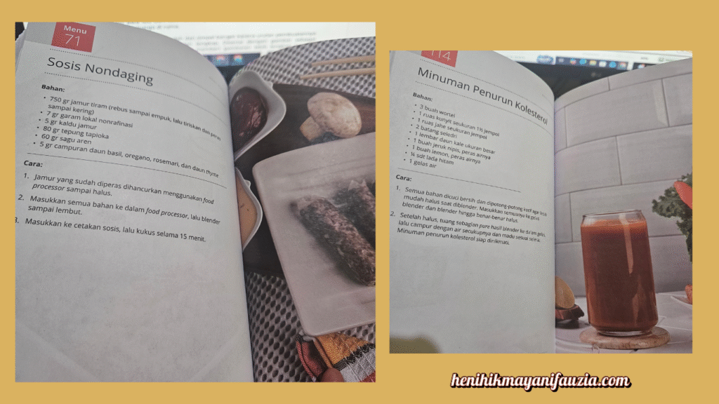 Naah, dari 114 jenis resep menu sehat di buku karangan dr. Zaidul ini ada beberapa menu resep yang saya suka dan bisa banget nih dijadikan bekal saat saya traveling. Resep pilihan saya adalah Minuman penurun kolesterol, agar agar kecerdasan, Peyek tempe, sosis nondaging, dan susu tempe. Kamu bisa baca di bukunya langsung yaa untuk resep-resep lengkapnya.