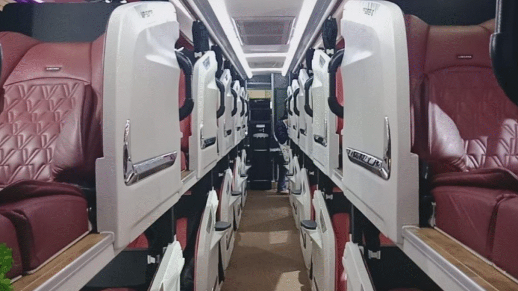 Jika kamu memilih bus malam Sleeper Bus, rasanya seperti masuk ke kamar aja sih tapi bisa berjalan di atas jalan raya. Begitu naik ke dalam bus, kamu tidak lagi melihat kursi seperti biasanya, melainkan di tengah itu ada lorong terus di sisi kanan dan kiri ada kursi yang sudah di set seperti tempat tidur yang tersusun rapi, biasanya satu di kiri dan satu di kanan, bahkan ada yang seperti kabin pribadi. Ada juga yang melengkapinya dengan tirai sehingga privasi sangat terjaga.