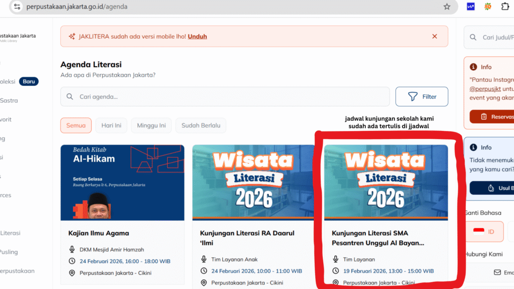 Dini memberi alur protokoler bagaimana cara kami berkunjung resmi ke Perpustakaan Jakarta. Jadi saya atas nama sekolah berkirim surat terlebih dahulu kepada pihak Perpustakaan Jakarta. Naah, nanti akan ada surat balasan dari pihak sana sebagai konfirmasi bahwa mereka menerima permintaan kunjungan. Jika permintaan kunjungan sudah fix diterima dan tanggal kunjungan sudah ada, maka kegiatan kunjungan akan tercatat di agenda literasi website Perpustakaan Jakarta.