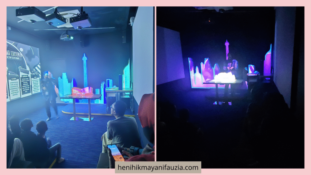 Dini mengajak kami ke lantai tujuh sebagai tujuan pertama. Lantai ini kan tempat kita salat duhur tadi , naah ternyata lantai tujuh ini ada layanan unggulan dan banyak menarik minat pengunjung. Layanan unggulan ini bernama Studio Immersive. Immersive Studio ini jadi konsepnya tuh seperti dilansir dari beritajakarta.id, dia menghadirkan perpaduan antara teknologi, arsip digital, dan ruang eksplorasi kreatif yang memungkinkan pengunjung menikmati literasi dengan kemasan yang lebih modern dan menarik.