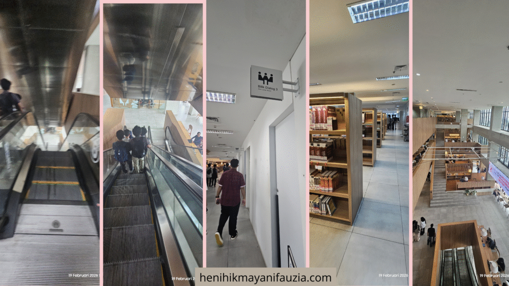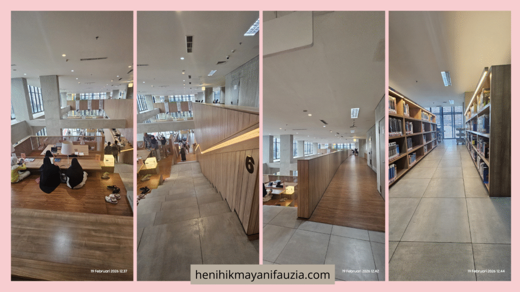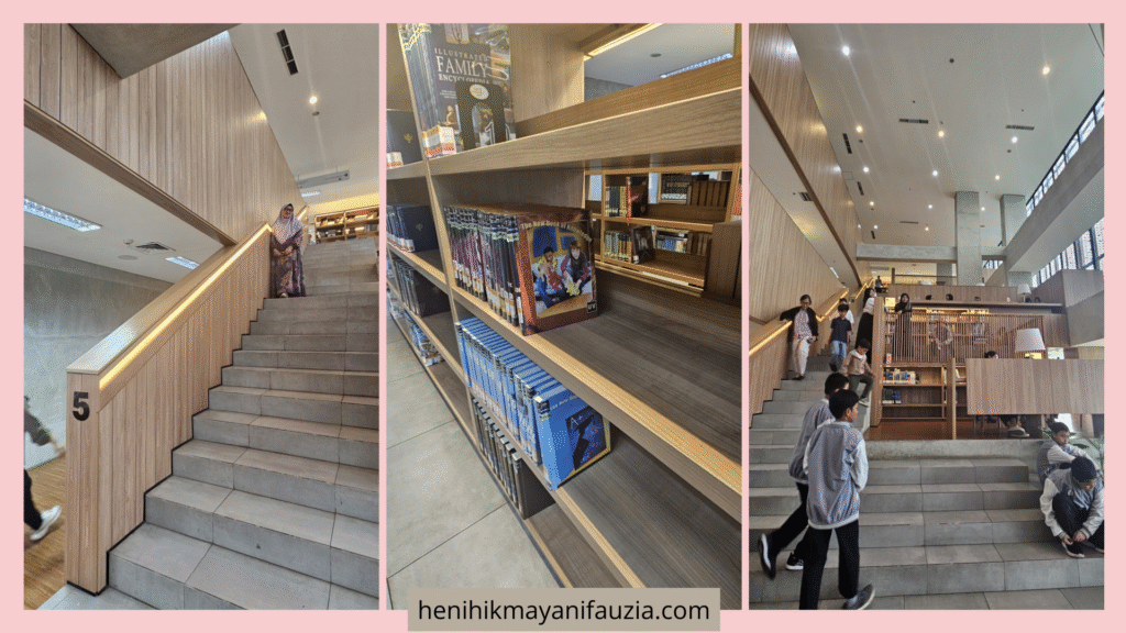 Setelah puas mengunjungi studio immersive, Dini mengajak kami ke lantai enam. Jadi Lantai enam, lima dan empat ini terhubung dengan satu tangga panjang selain ada eskalator seperti penghubung lantai lainnya. Desain bangunan di tiga lantai ini juga sangat indah dan estetik. Pokokknya kalau ke Perpustakaan Jakarta jangan lupa foto yaa….Keren banget suasananya.