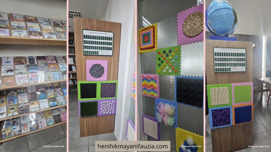 Oh iya, lantai enam ini ada deretan rak berisi buku-buku dari berbagai subjek, ada juga ruang koleksi untuk tuna netra. Ada buku braille dan globe khusus untuk penyandang tuna netra. Sisi bagian timur berderet meja dan kursi untuk pengunjung membaca.