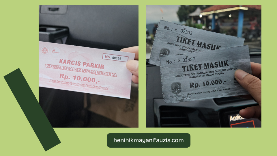 Buat kamu yang baru pertama kali berkunjung ke Wisata Paralayang Majalengka ini, jangan kaget yaa nanti tuh akan ditarik retribusi parkir oleh petugas di bawah sebelum masuk area wisata. Karcis parkir dihitung per kendaraan dan untuk mobil itu sepuluh ribu rupiah.