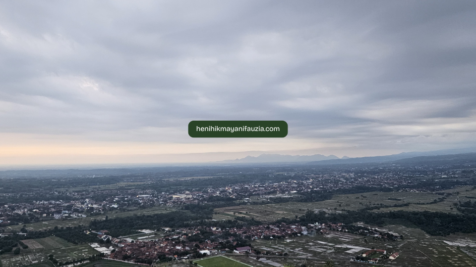 Dari atas bukit bisa terlihat hamparan sawah hijau sejauh mata memandang, rumah-rumah penduduk, ada juga lapangan tempat pendaratan paralayang, pesona bukit-bukit di sekitar yang memukau dan jalan desa yang terlihat dari atas bukit seperti jalanan labirin. Gunung Ciremai sendiri tidak terlihat soalnya pas saya kesini cuaca agak mendung.