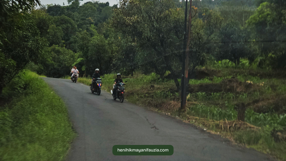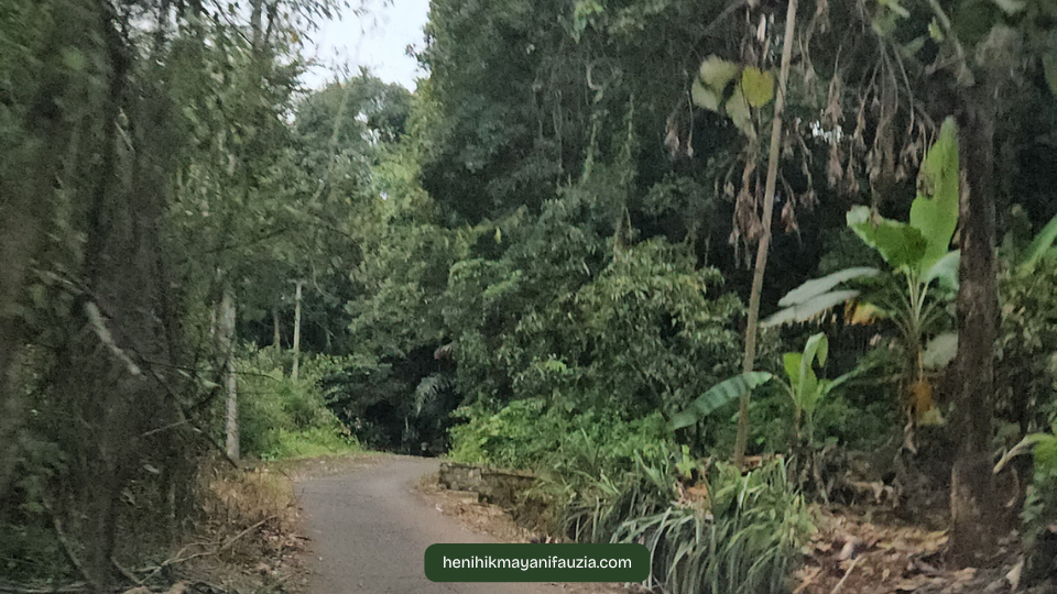 Makin dalam menuju arah bukit jalannya makin sempit dan menanjak. Sepertinya supir yang mengendarai mobil mesti handal membawa mobilnya. Di bagian atas , pemandangan yang tersaji sudah bukan sawah lagi tapi kebun mangga, kebun pisang dan kebun lainnya di sisi kanan dan kiri jalan.